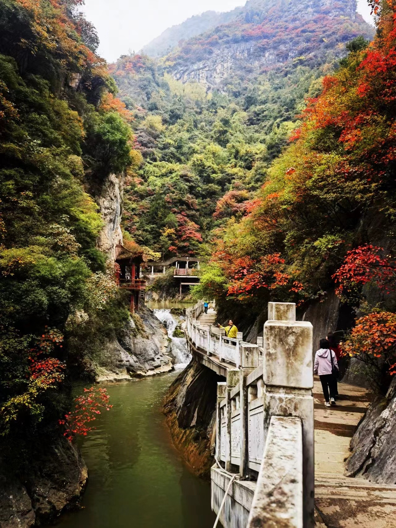 峡谷内的山林依次铺开金黄、橙红、深红的渐变层次